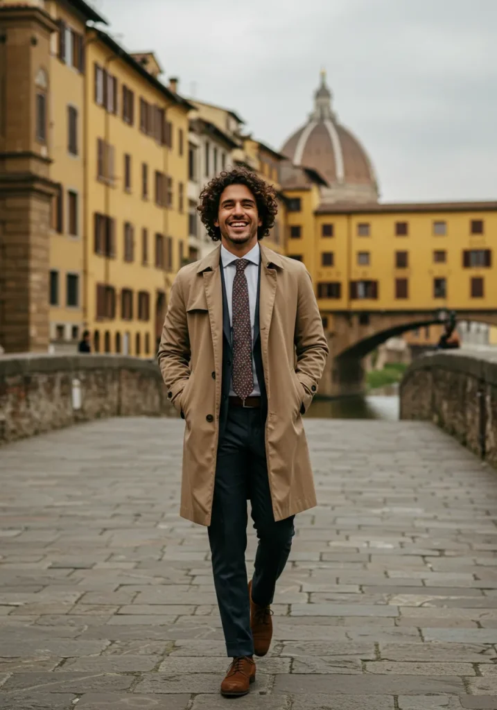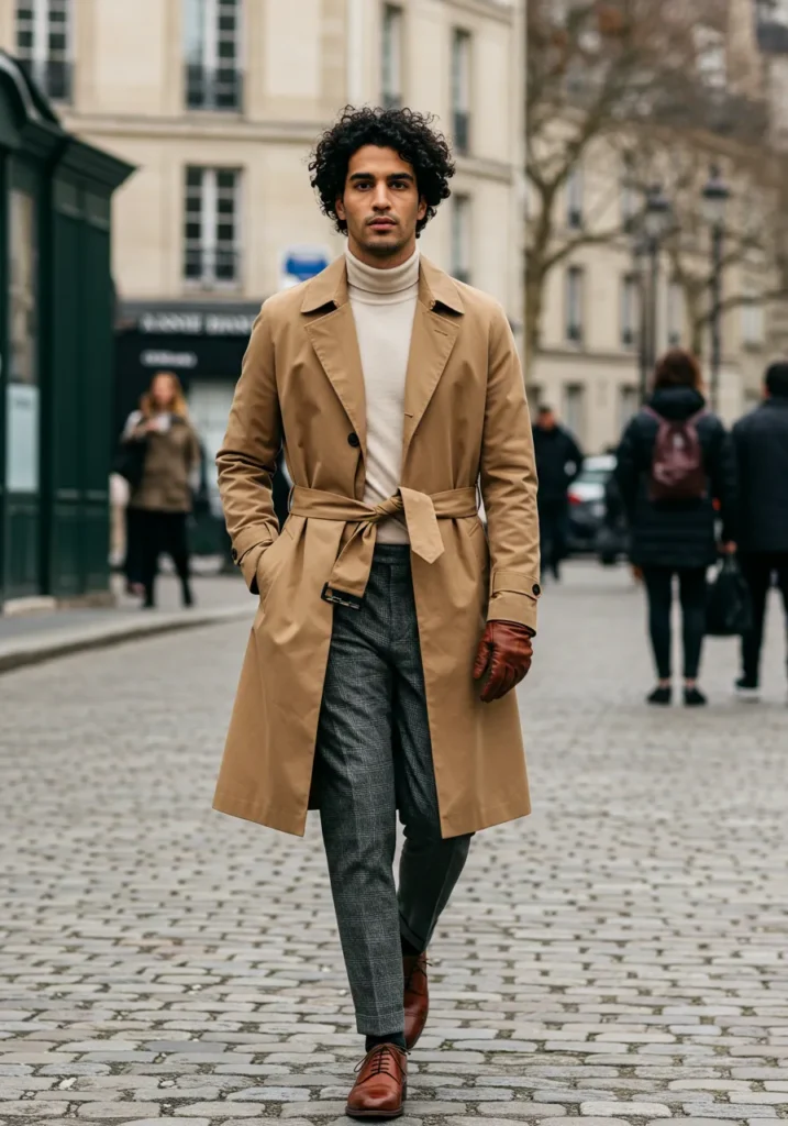 I personally adore this look because it’s so clean and elegant. There’s something about a man in a camel trench that just screams timeless confidence. Add in those little touches of brown leather, and it feels incredibly put-together without looking like he’s even tried too hard.