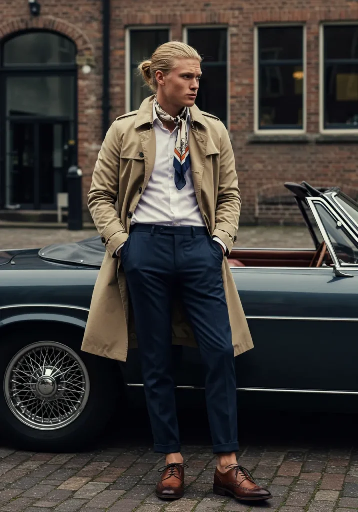 Here the camel trench is paired with navy trousers, a white shirt, and polished brown shoes. The silk scarf tied around the neck adds a striking, retro European touch that makes the outfit unforgettable.