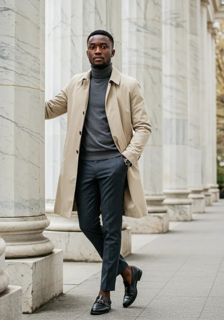 This look is minimal yet incredibly stylish. A beige trench is worn over a charcoal turtleneck with slim grey trousers and black loafers. It’s sleek, modern, and undeniably chic.