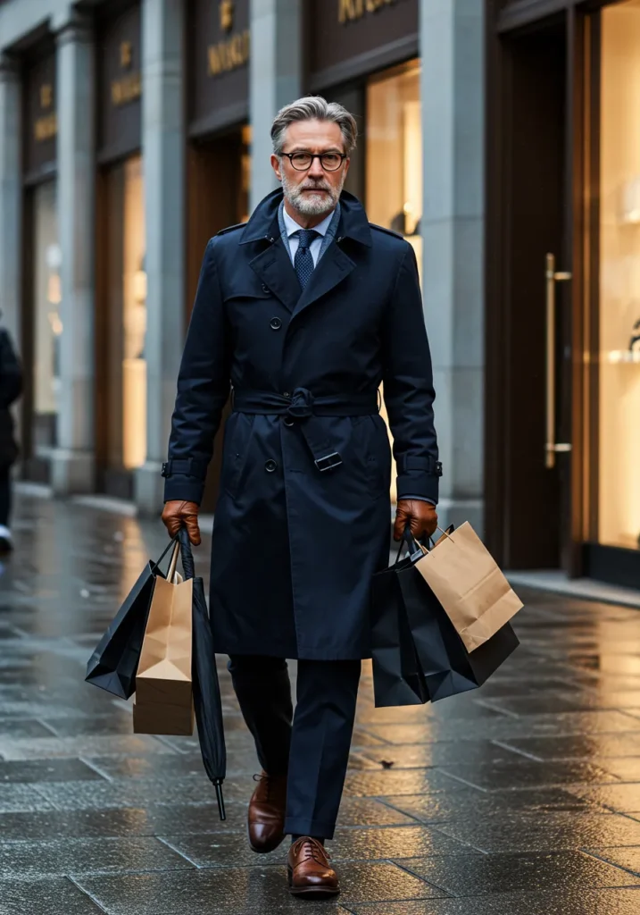 Here we have a navy trench tied neatly at the waist, worn over a full business suit with brown leather shoes and tan gloves. The shopping bags and umbrella add that touch of everyday luxury.
