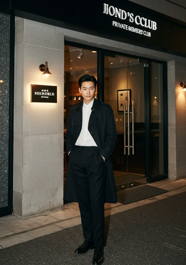 This look is a masterclass in simplicity. A long black trench is paired with tailored black trousers, a crisp white shirt, and sleek black shoes. The monochrome palette creates a sharp silhouette that feels very private members’ club chic.