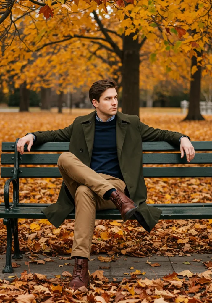 Here we see an olive trench styled with a navy sweater layered over a checkered shirt, tan chinos, and brown leather boots. Surrounded by golden autumn leaves, it feels effortlessly cozy yet perfectly refined.