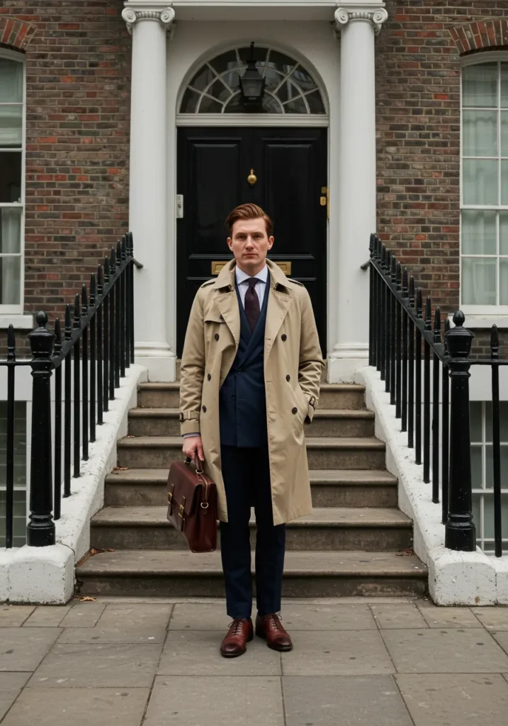 This look is pure heritage business style. A beige trench coat is layered over a navy suit with a crisp shirt and tie. Brown leather shoes and a structured briefcase complete the look, making it perfect for city commutes or important meetings.