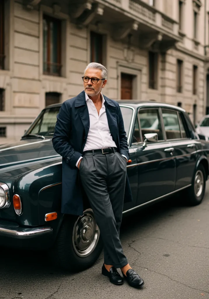 Here we see a navy trench coat styled with a crisp white shirt, tailored grey trousers, and classic black loafers. The open collar keeps it from feeling stuffy, and the glasses bring in that intellectual charm. Leaning casually against a vintage car, the outfit is giving pure heritage luxury.