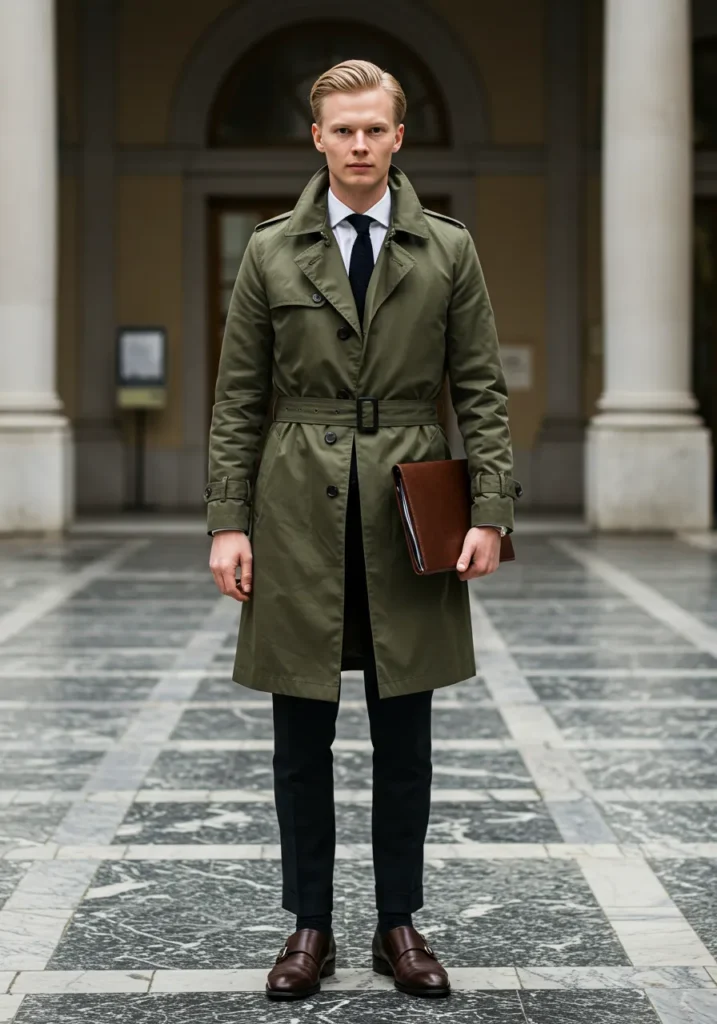 This trench outfit features an olive green coat worn over a white shirt, slim tie, and tailored black trousers. The dark brown monk strap shoes and sleek leather portfolio bring the whole look together, making it perfect for business settings with a little extra edge.