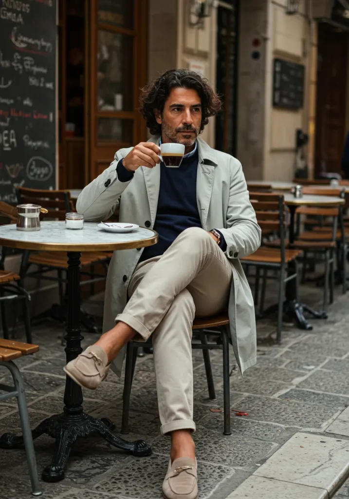 A soft grey trench coat paired with beige chinos, a navy sweater layered over a shirt, and suede loafers makes this look perfect for café moments. It’s relaxed but still crisp, ideal for enjoying a coffee outdoors or an afternoon stroll.