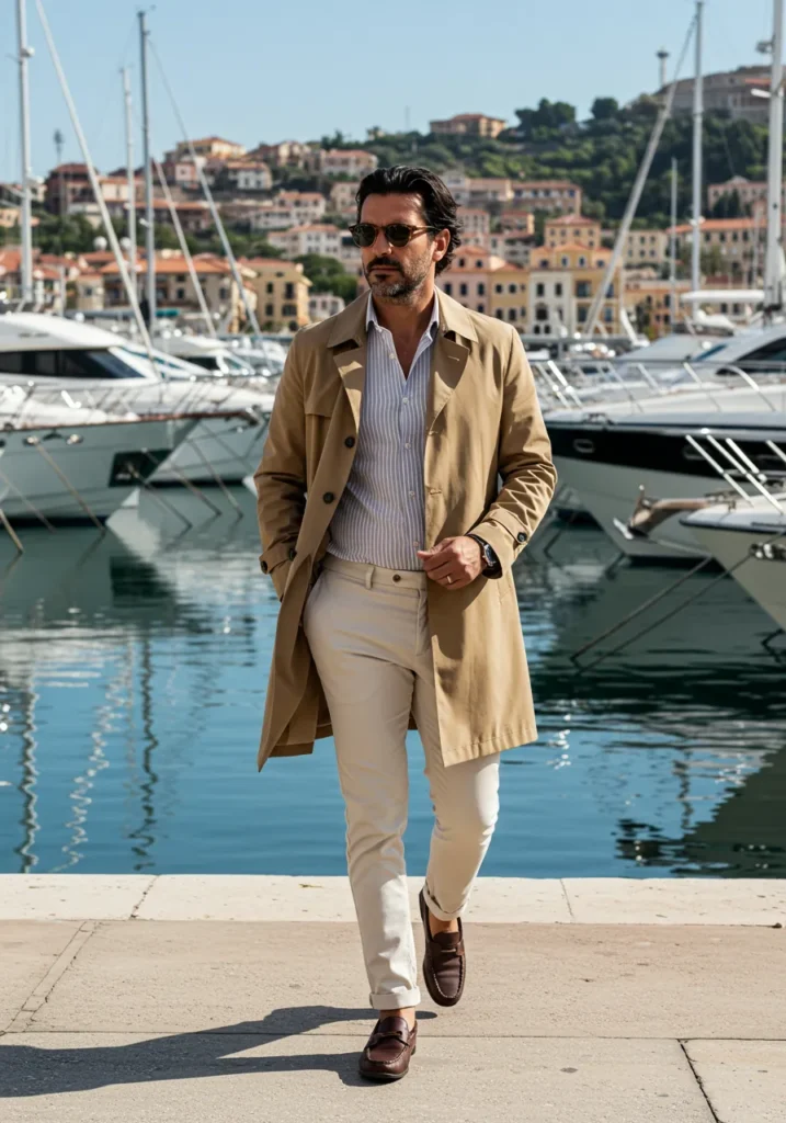 This outfit features a camel trench coat paired with a light blue striped shirt, cream trousers, and brown loafers. Styled with sunglasses, it feels like the perfect yacht club look. It’s fresh, breezy, and polished enough for seaside settings.