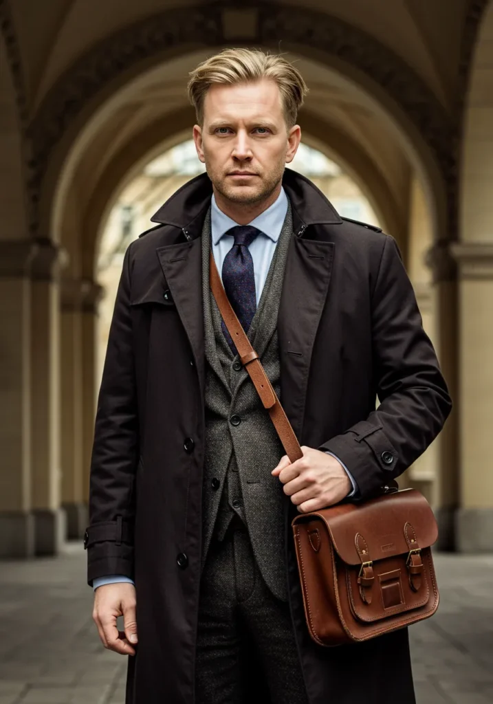 I love this outfit because it’s all about authority and elegance. The dark trench over a suit is such a powerful pairing, and the leather satchel adds that polished, academic touch. It’s the kind of outfit that makes you instantly respect the wearer.