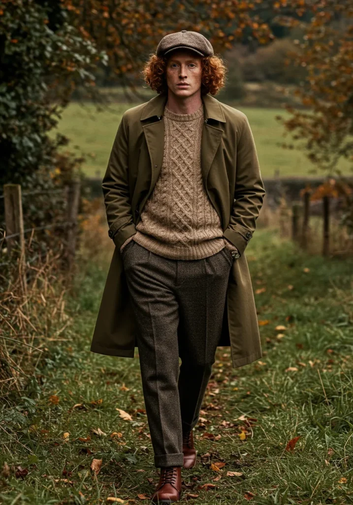 This look embraces heritage style with an olive trench coat worn over a chunky cable-knit sweater, tailored wool trousers, and lace-up brown boots. The addition of a flat cap ties it beautifully to that countryside old money aesthetic.