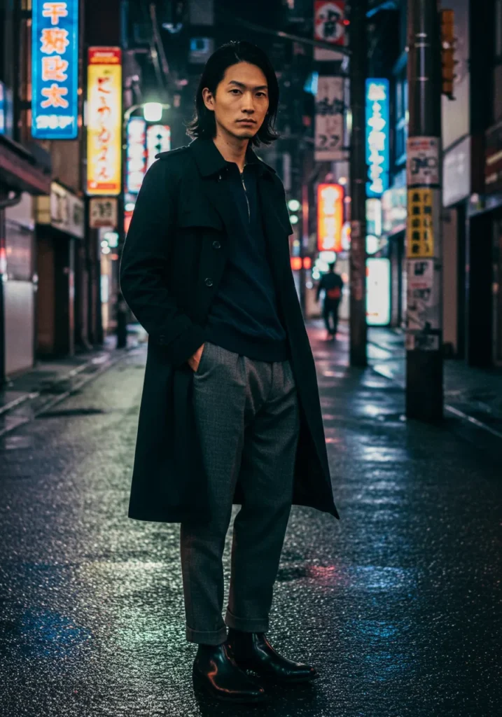 This trench is styled casually with grey trousers, a navy knit, and polished Chelsea boots. The city lights and wet streets create that cinematic, late-night elegance, giving the whole look an urban edge.