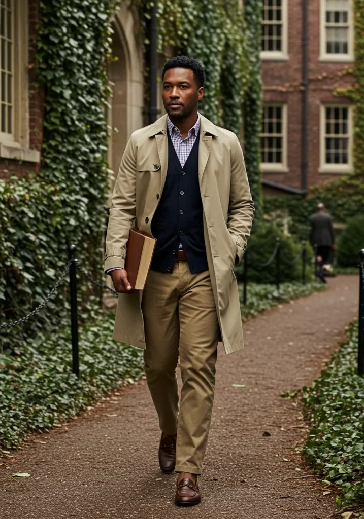 A beige trench is layered over a checkered shirt, navy cardigan, and tan chinos, finished with brown loafers. With a leather-bound book in hand, it has that Ivy League professor feel we all secretly swoon over.