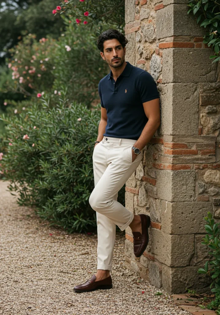 Here we have a crisp navy polo paired with slim white chinos and brown loafers. The clean tuck and subtle accessories, like the watch, keep it refined while the stone wall backdrop adds a rustic European charm.