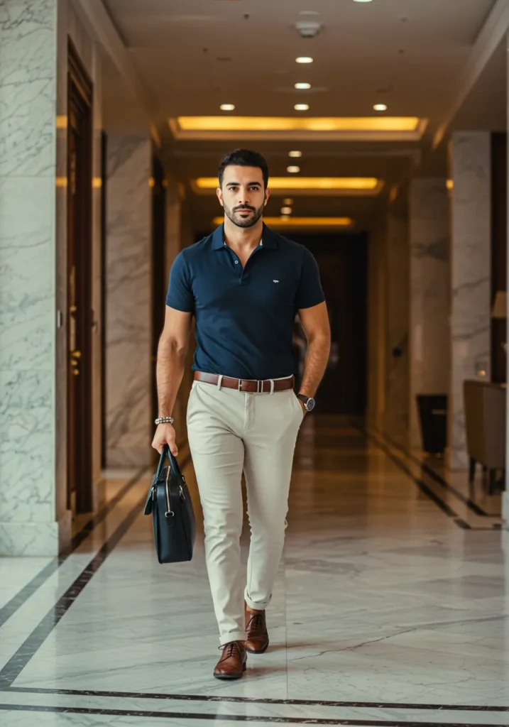 This outfit combines a fitted navy polo with cream chinos and polished brown shoes, accessorized with a leather belt and a sleek black bag. The marble hallway backdrop makes it even more refined.