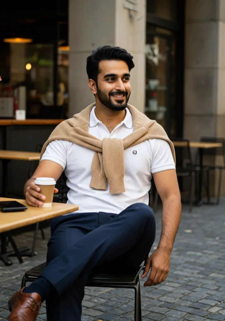 This outfit pairs a classic white polo with navy trousers, styled with a tan sweater tied over the shoulders for that extra polished touch. Brown shoes and a coffee cup in hand make it feel lived-in yet elevated.