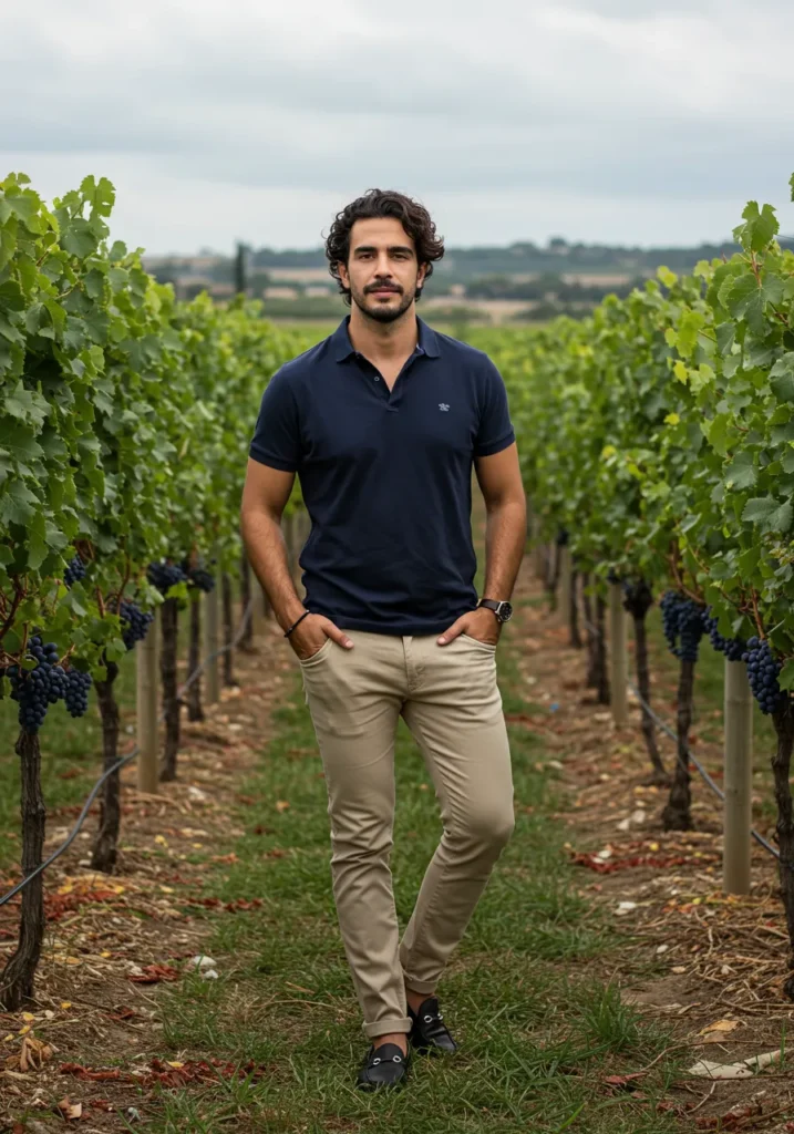 Here we see a fitted navy polo styled with beige chinos and dark loafers, set against the lush backdrop of a vineyard. The rolled sleeves and hands in the pockets add a natural ease.