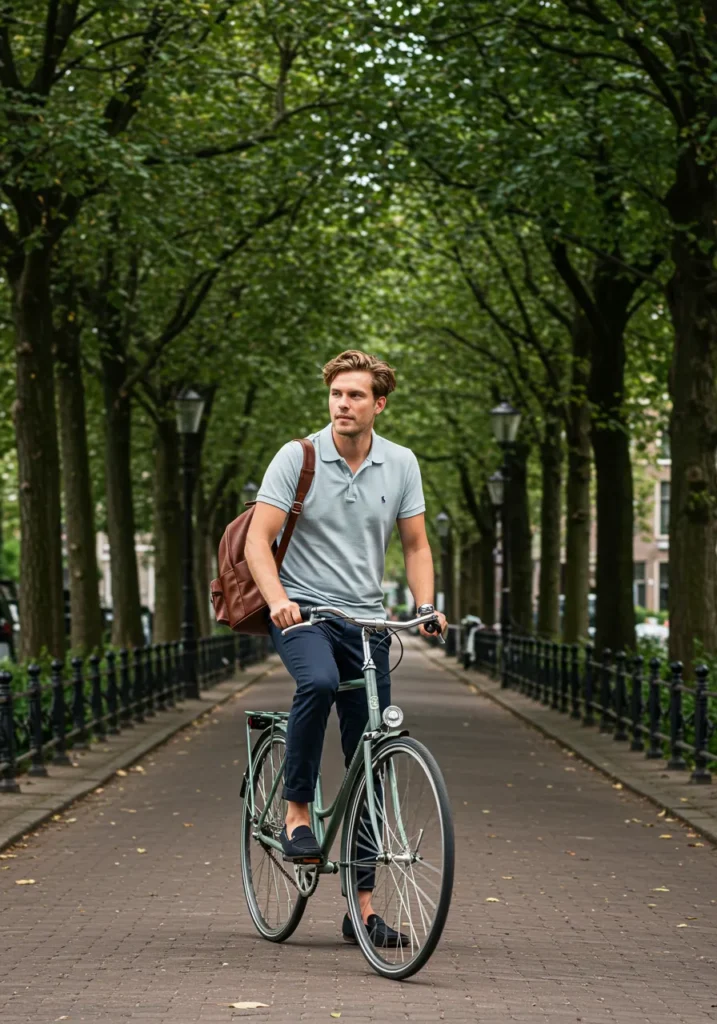 This look features a soft grey polo paired with slim navy trousers and loafers, finished off with a brown leather backpack slung over one shoulder. The bicycle adds to the relaxed sophistication, making it feel like a stylish city ride through leafy streets.