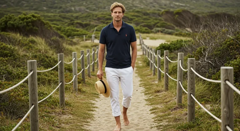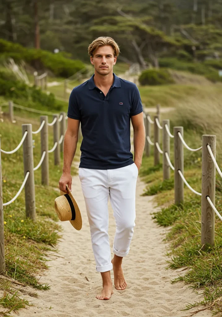 A fitted navy polo is paired with rolled white trousers for a breezy coastal vibe. Walking barefoot on the sand while holding a straw hat makes the whole outfit feel relaxed yet upscale.