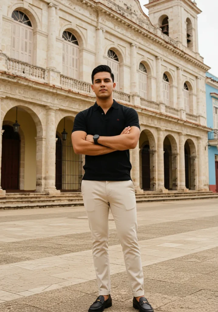 This outfit features a sleek black polo matched with cream chinos and black loafers. The architectural backdrop makes the look feel sharp, structured, and refined.