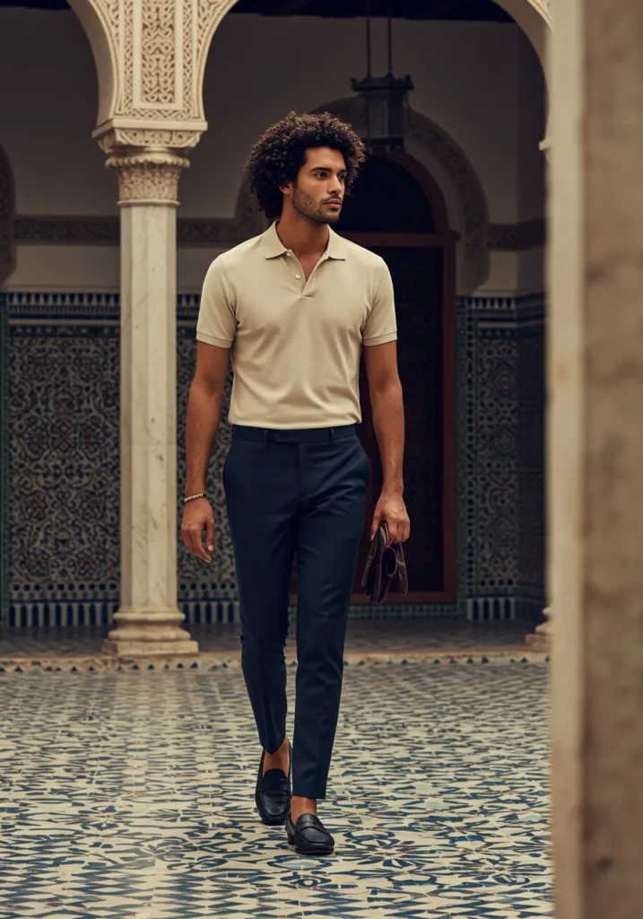 A soft beige polo tucked into slim navy trousers and styled with black loafers creates a refined balance. The leather folio in hand adds a sophisticated accessory to the overall look.