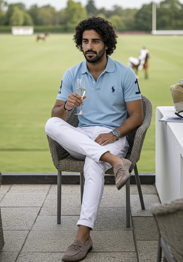 A light blue polo sets a refreshing tone when styled with white trousers and taupe loafers. The man is seated with a champagne glass in hand, adding that perfect touch of prestige.