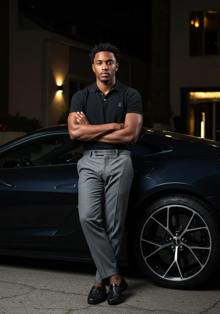 This look combines a fitted black polo with sharp grey trousers and classic loafers. Standing against a sleek car, the outfit feels bold yet restrained, proving that simple colors can carry serious impact.