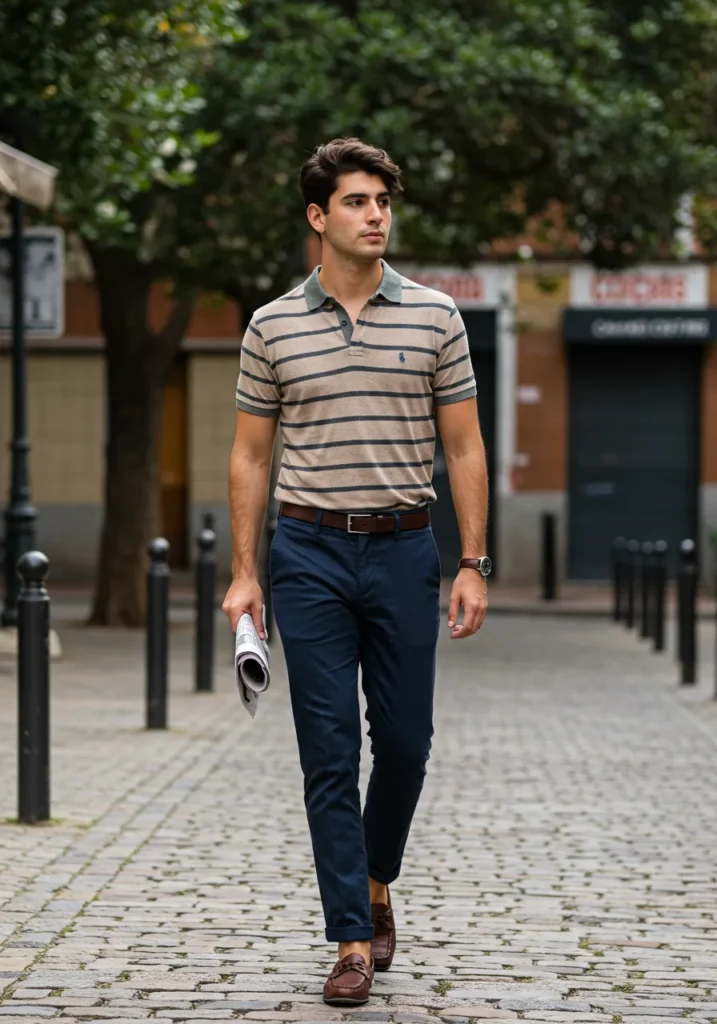 A beige striped polo tucked into navy trousers gives this outfit a preppy edge. Brown loafers and a leather belt keep it cohesive, while the casual walk with a folded newspaper makes it feel like a polished everyday look.