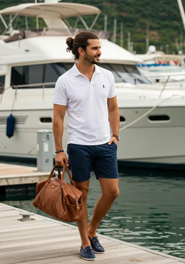 Here is a perfect yacht-day look with a crisp white polo and tailored navy shorts. Navy loafers and a brown leather weekender bag complete the outfit, adding just the right touch of leisure and luxury.