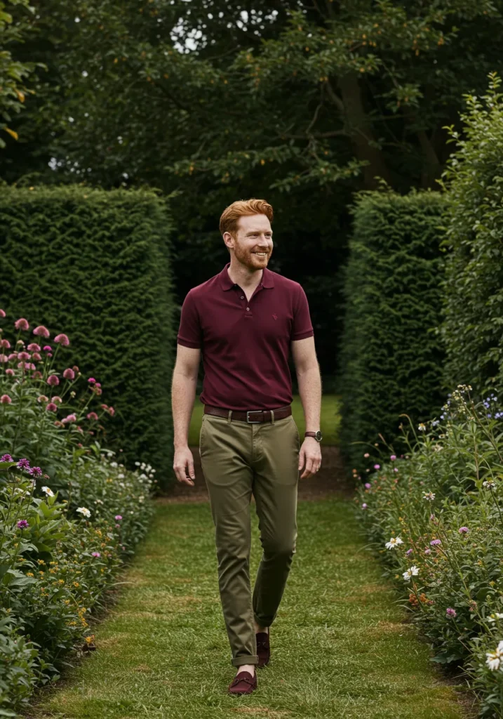 A deep burgundy polo tucked into olive trousers, finished with matching loafers, creates a rich and earthy combination. The brown belt and watch pull the details together seamlessly.
