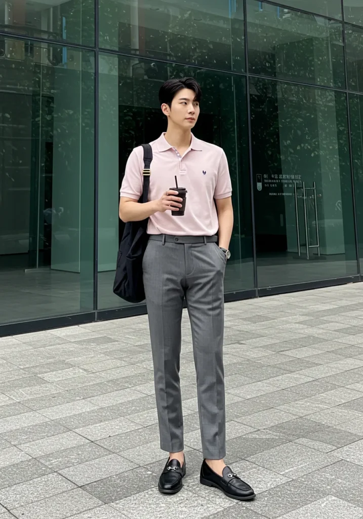 This outfit balances modern polish with classic ease. The pale pink polo is tucked neatly into tailored grey trousers, paired with sleek black loafers. A black bag over the shoulder and a coffee in hand give it that effortless city-ready vibe.