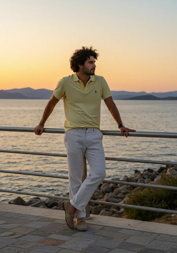 Here we see a pale yellow polo styled with loose white linen trousers and beige loafers. The backdrop of the ocean at sunset makes the entire outfit feel dreamy and elegant.