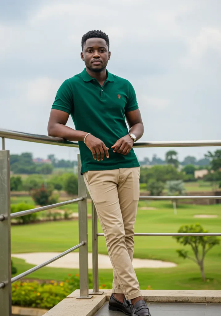 A deep green polo shirt paired with beige chinos and black loafers creates a bold yet understated look. Leaning against a railing with a golf course behind him, the outfit feels crisp and composed.