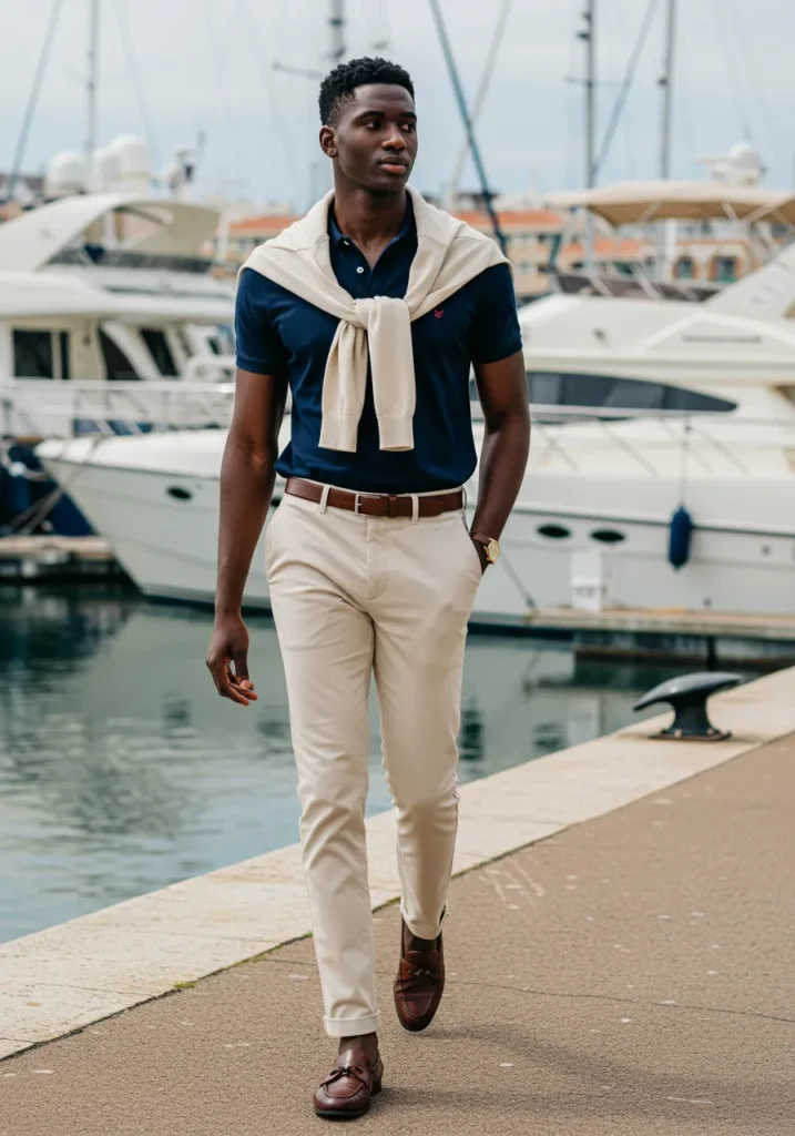 This look is pure marina elegance. A navy polo is tucked neatly into cream tailored trousers, paired with a slim brown belt and loafers. The cream sweater draped over the shoulders adds an old money touch that feels relaxed yet elevated. The yachts in the background tie it all together, giving this outfit the perfect vacation-in-the-Riviera vibe.