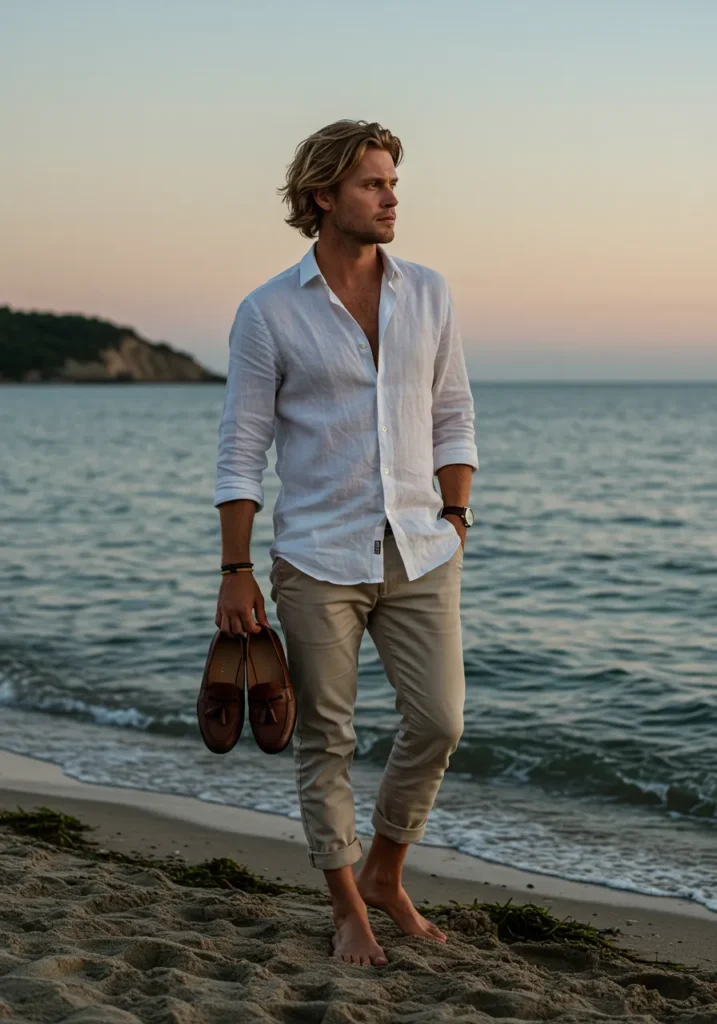 This outfit is simple yet full of charm. A white linen shirt is paired with beige chinos, barefoot at the shoreline while holding brown loafers. The rolled hems and undone buttons give the whole look a breezy, lived-in feel.