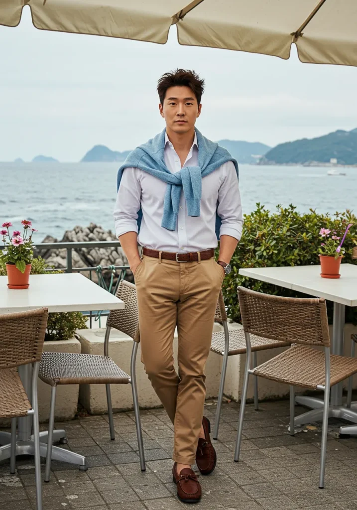 This outfit is relaxed but refined. A white shirt is styled with khaki trousers, brown loafers, and a light blue sweater draped across the shoulders. The seaside café tables and potted flowers add to the easy charm of the look.