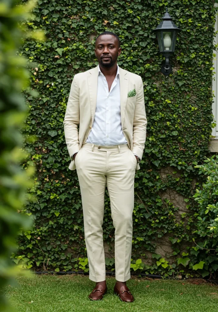 This outfit is sharp and confident. A cream tailored suit is paired with a crisp white shirt, brown loafers, and a striking green pocket square for a subtle pop of color. The ivy-covered wall behind him makes the look feel timeless and sophisticated.
