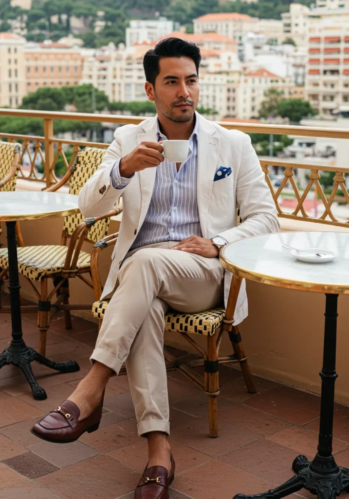 This look blends smart tailoring with relaxed ease. A cream blazer is layered over a striped blue shirt, paired with beige trousers and burgundy loafers. The pocket square and coffee cup in hand complete the refined morning vibe on a sunlit balcony.