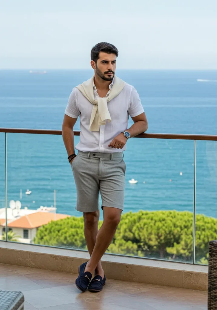 This look is sleek and understated. A white short-sleeve shirt is tucked into grey tailored shorts, paired with navy loafers and a cream sweater draped casually over the shoulders. The man leans against the balcony railing, with the sea view behind him, making the outfit feel both relaxed and refined.