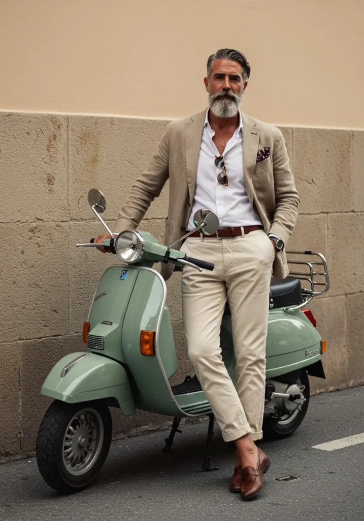 This outfit screams timeless Italian elegance. A beige blazer is worn over a crisp white shirt, styled with cream tailored trousers and brown loafers. The pocket square adds character, and the vintage Vespa completes the effortlessly stylish aesthetic.