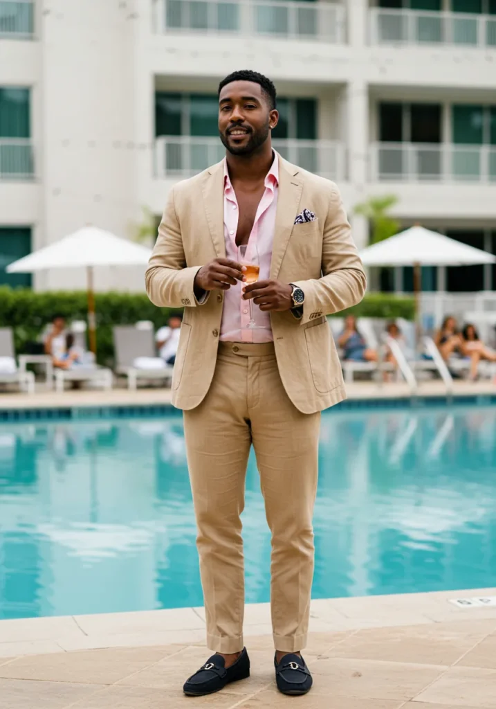 This look is refined yet playful. A tan linen suit is styled with a soft pink shirt, unbuttoned at the top for a relaxed touch. Navy loafers and a patterned pocket square finish the look, while the poolside setting makes it clear this is vacation luxury done right.