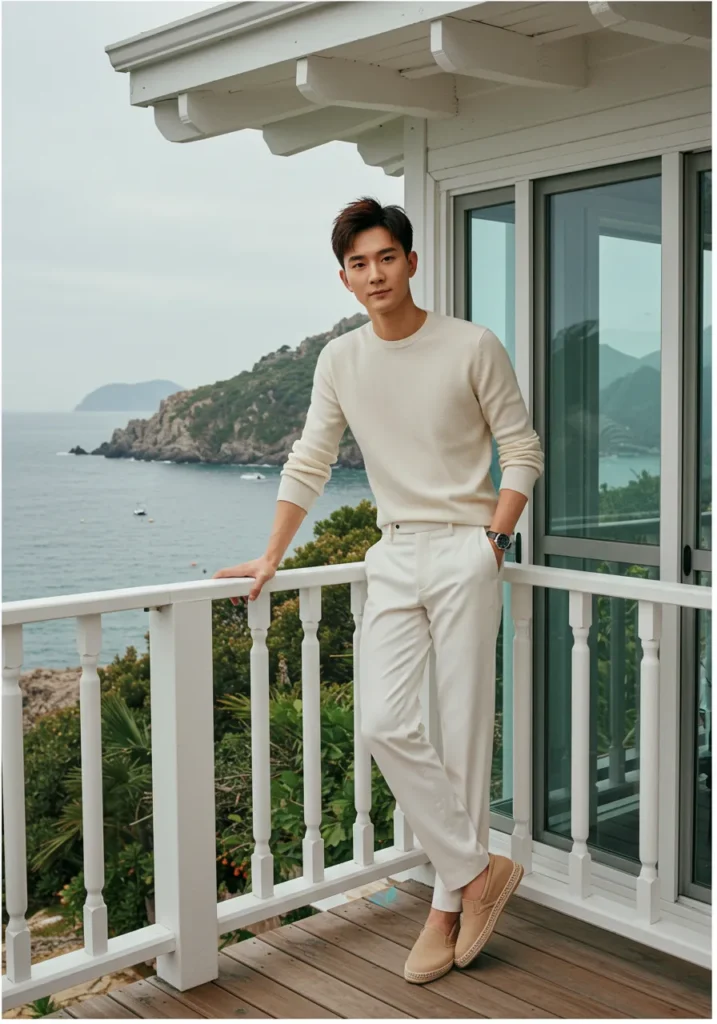 This outfit leans into minimalism with maximum impact. A cream sweater is tucked into matching trousers, styled with beige loafers. The clean lines, subtle watch, and coastal balcony setting make it effortlessly sleek.