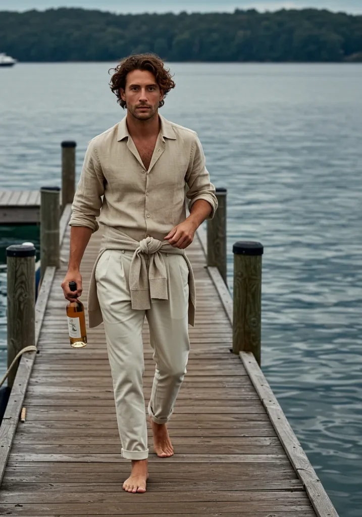 This outfit mixes relaxed tailoring with natural ease. A beige linen shirt is paired with cream trousers, with a sweater tied casually around the waist. Barefoot on a wooden dock, holding a bottle of wine, the vibe is laid-back luxury at its finest.