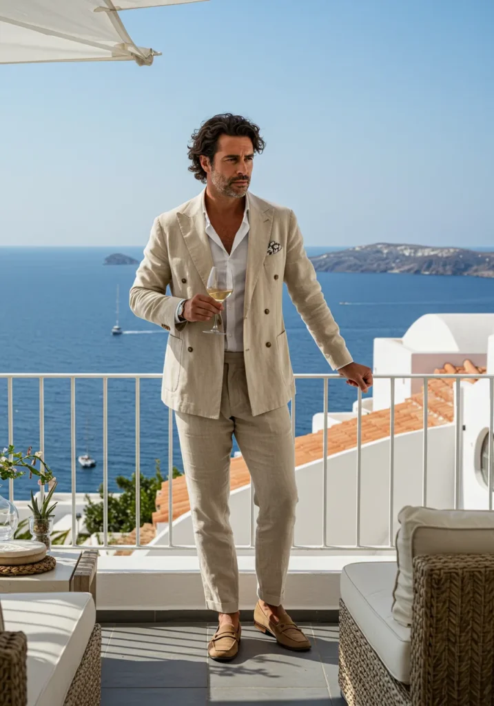 This outfit features a classic linen suit in a soft beige tone with a double-breasted jacket. Worn with a crisp white shirt, open at the collar, and paired with tan loafers, the look is sharp yet relaxed. The pocket square adds a subtle statement, while the balcony setting with a sea view makes the whole scene picture-perfect.