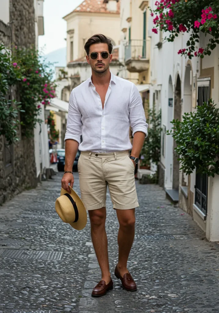 This outfit nails vacation polish with ease. A classic white linen shirt is paired with tailored beige shorts, accessorized with brown loafers and a straw hat in hand. The clean fit and rolled sleeves create a breezy yet sharp look, while the cobblestone street and blooming flowers add that picture-perfect backdrop.