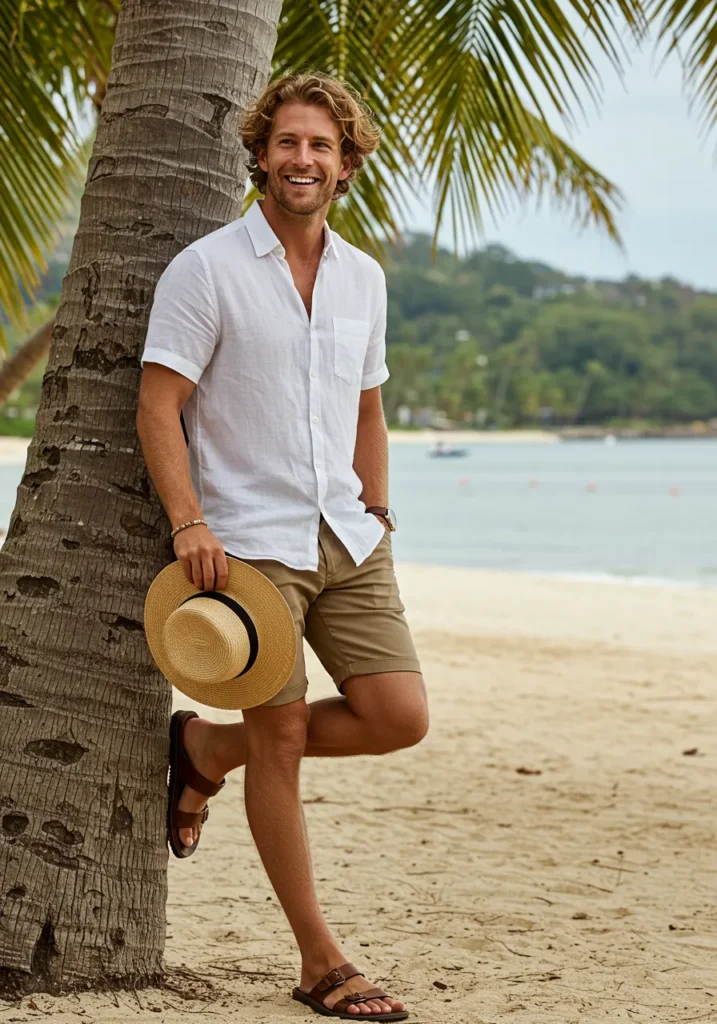 This look keeps it simple yet stylish. A white short-sleeve linen shirt is paired with fitted khaki shorts, finished off with dark leather sandals. The straw hat in hand adds a classic vacation accessory, while the natural beach backdrop gives the outfit its laid-back charm.