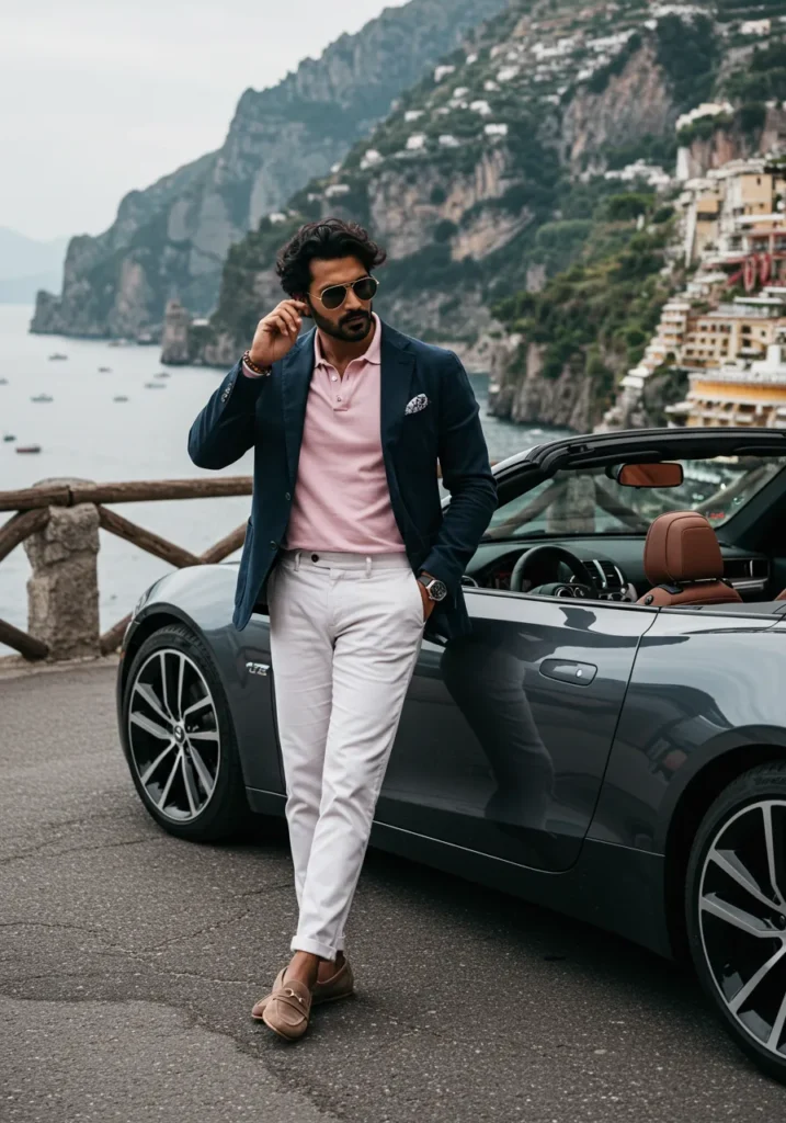 This outfit is the definition of polished vacation style. A navy blazer is layered over a pale pink polo, tucked neatly into white tailored trousers. The suede loafers, pocket square, and aviator sunglasses make the look even sharper. The convertible and cliffside setting complete the sophisticated vibe.