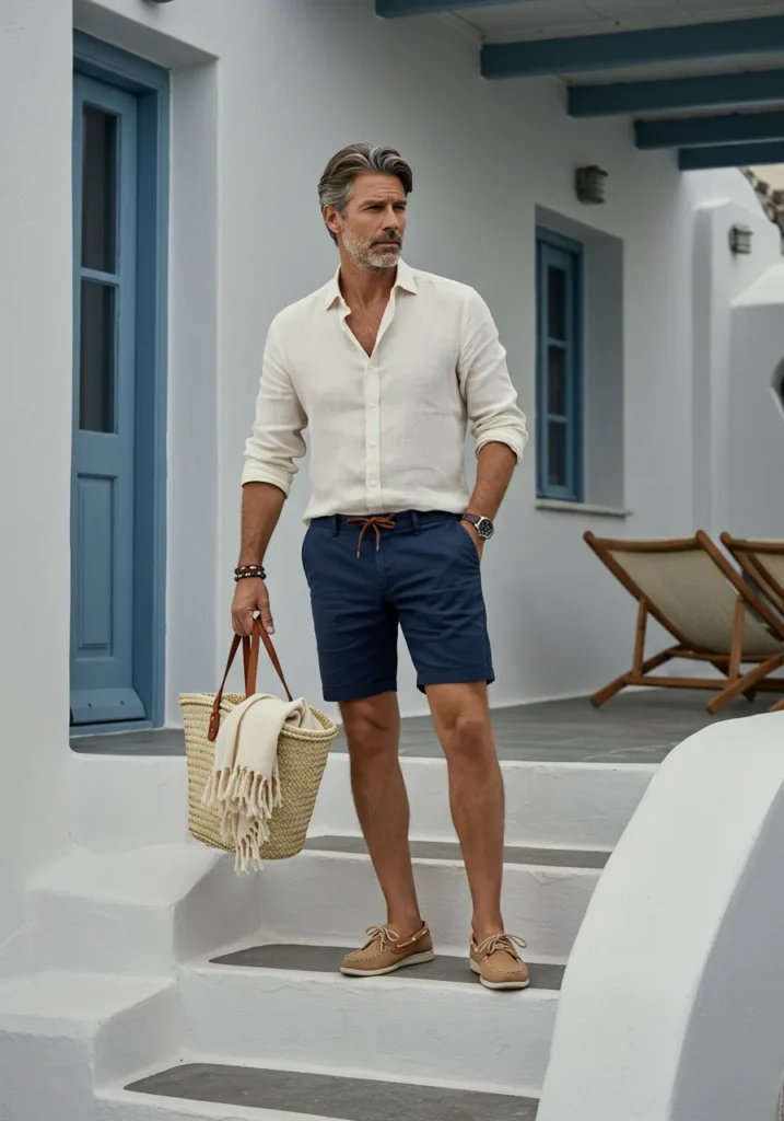 This look leans into breezy sophistication. A light cream linen shirt is casually tucked into navy tailored shorts, paired with boat shoes. The man carries a woven tote bag with a throw blanket inside, making the outfit practical while still chic. The whitewashed house in the background enhances the resort-like feeling.