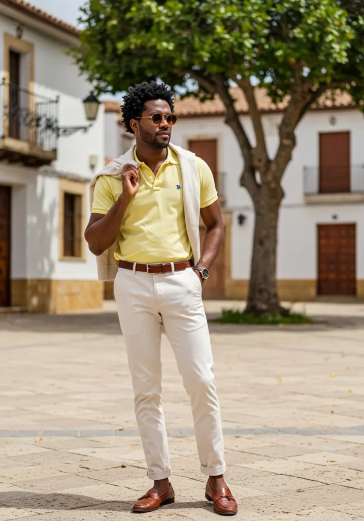 This outfit features a soft yellow polo paired with white tailored trousers and polished brown loafers. A beige sweater is casually draped over the shoulders, and round sunglasses give the final touch of sophistication. The clean village square backdrop keeps the look fresh and timeless.