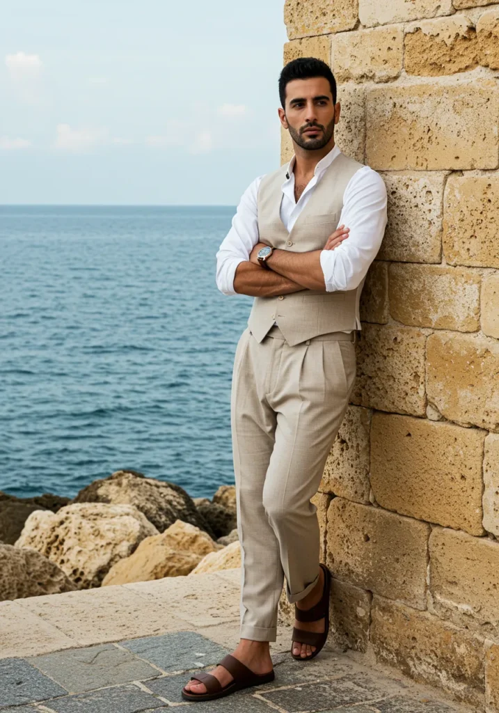 This outfit blends effortless charm with coastal sophistication. The man is wearing a beige vest layered over a crisp white shirt, rolled at the sleeves for a casual touch. His pleated linen trousers match the vest perfectly, and the dark leather sandals balance the light tones. The watch adds a polished accent while the stone wall and sea backdrop make the look feel timeless.