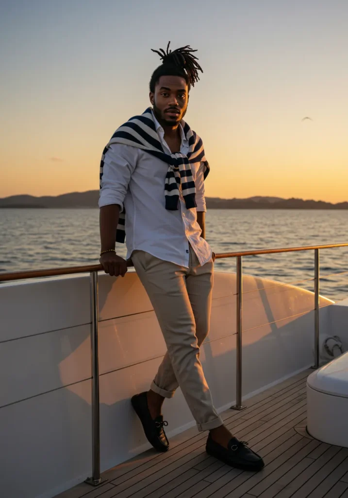 This outfit is all about yacht-ready elegance. A crisp white shirt is worn with cream chinos and black loafers, while a navy striped sweater is draped over the shoulders. The warm glow of the sunset sets the scene perfectly for this effortlessly refined style.