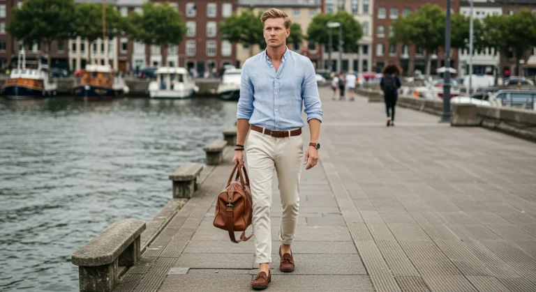 This look is fresh and polished with a coastal charm. A light blue linen shirt is tucked into slim cream trousers, styled with a braided brown belt, leather loafers, and a matching brown weekend bag. The marina backdrop with sailboats completes the refined vacation vibe.